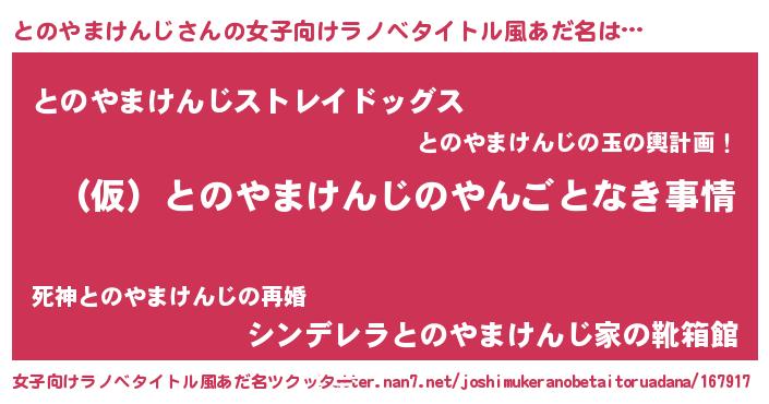 | 胡散臭い通販商品みたいなあだ名 | 『必ず成功する霊験あらたかなお札…その名も「とのやまけんじ」』 |