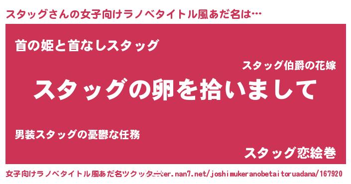| 男性向けラノベタイトル風あだ名 | 『スタッグの嫁は女の子じゃないと思った?』 |