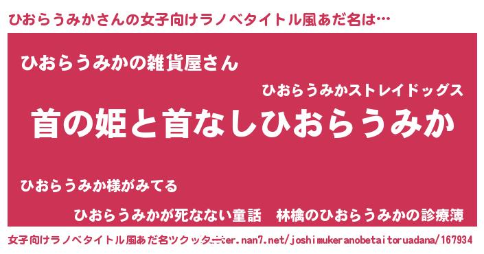 | 男性向けラノベタイトル風あだ名 | 『はたらくひおらうみかさま!』 |