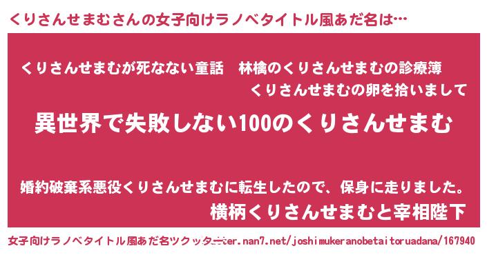 | 男性向けラノベタイトル風あだ名 | 『くりさんせまむという概念が存在しない退屈な世界 』 |