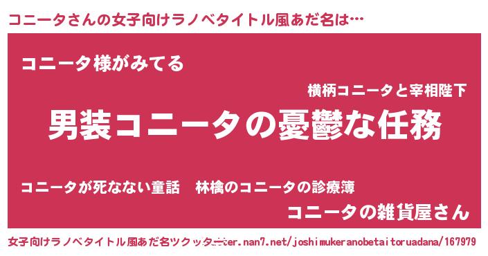 | 男性向けラノベタイトル風あだ名 | 『うちのコニータが世界を掌握している!』 |