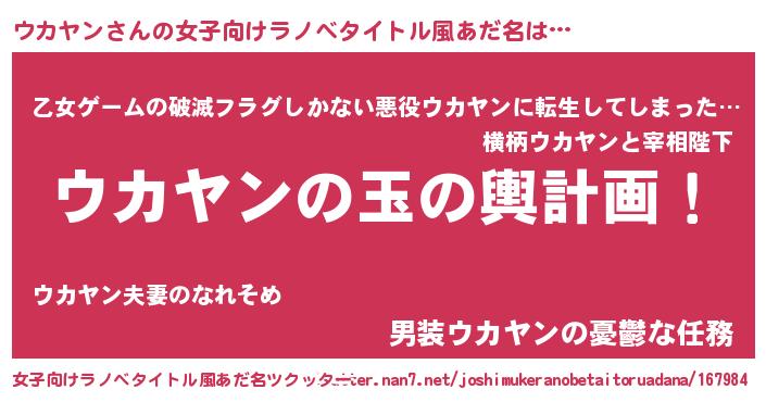 | 男性向けラノベタイトル風あだ名 | 『転生したらウカヤンだった件』 |