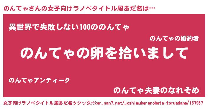 | 男性向けラノベタイトル風あだ名 | 『のんてゃの嫁は女の子じゃないと思った?』 |