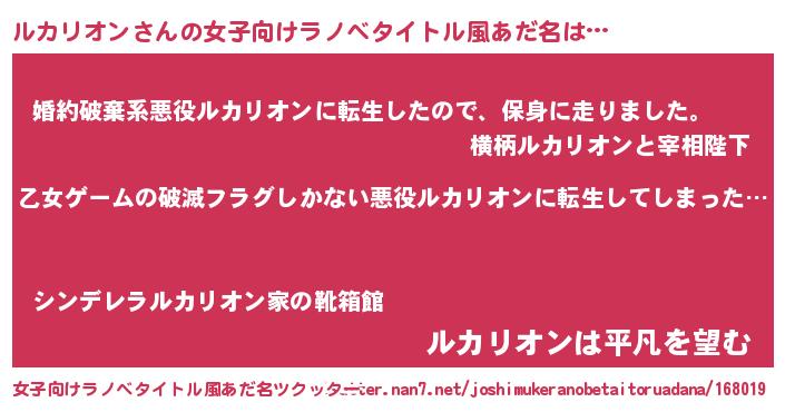 | 男性向けラノベタイトル風あだ名 | 『この素晴らしい世界にルカリオンを!』 |
