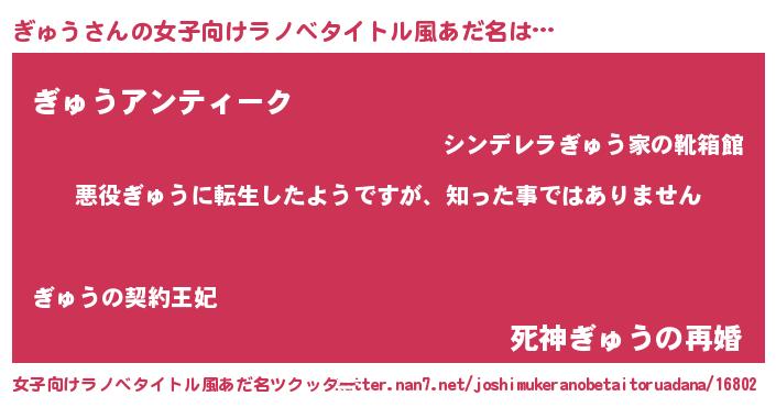 | 男性向けラノベタイトル風あだ名 | 『この素晴らしい世界にぎゅうを!』 |