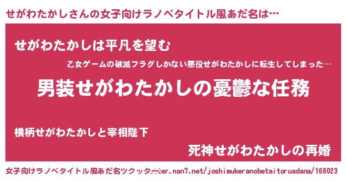 | 男性向けラノベタイトル風あだ名 | 『冴えないせがわたかしの育てかた』 |