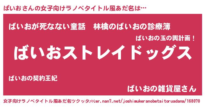 | 男性向けラノベタイトル風あだ名 | 『Re:ばいおから始める異世界生活』 |