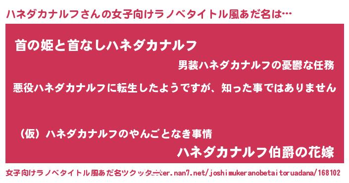 | 男性向けラノベタイトル風あだ名 | 『この素晴らしい世界にハネダカナルフを!』 |