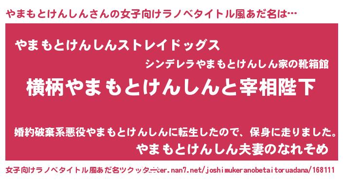 | 男性向けラノベタイトル風あだ名 | 『やまもとけんしんに滅ぼされるだけの簡単なお仕事です』 |
