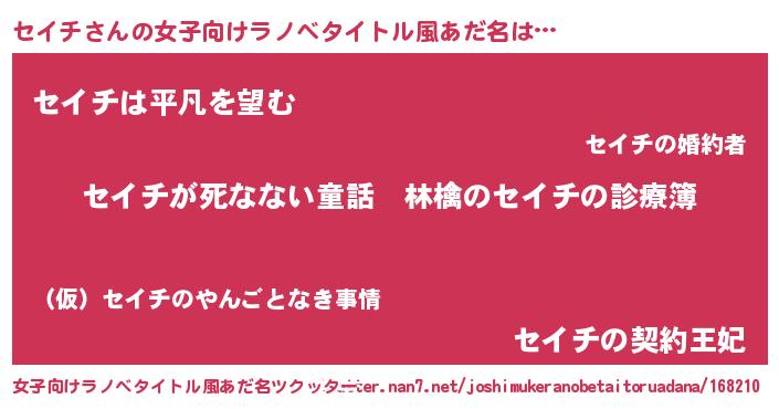 | 男性向けラノベタイトル風あだ名 | 『魔弾の王とセイチ』『セイチの憂鬱』 |
