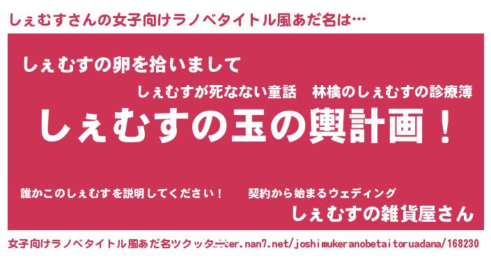 | 胡散臭い通販商品みたいなあだ名 | 『全米が絶賛したサプリメント…その名も「しぇむす」』 |