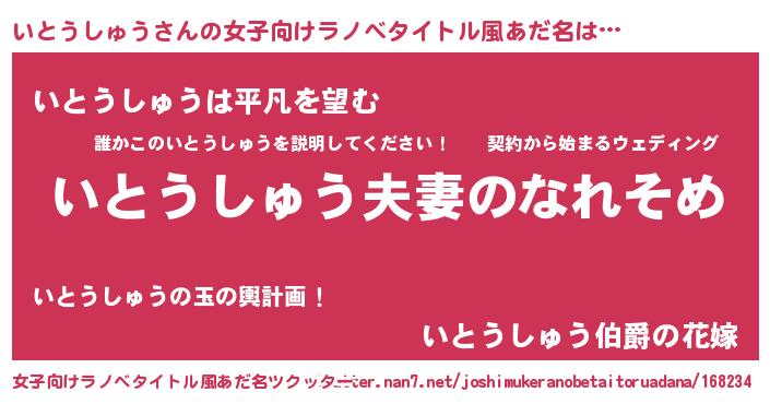 | 男性向けラノベタイトル風あだ名 | 『おまえをオタクにしてやるから、俺をいとうしゅうにしてくれ! 』 |