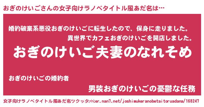おぎのけいごさんの女子向けラノベタイトル風あだ名は… 『おぎのけいご夫妻のなれそめ』『婚約破棄系悪役おぎのけいごに転生したので、保身に走りました。』『男装おぎのけいごの憂鬱な任務』 ツクッター #女子向けラノベタイトル風あだ名ツクッター http://tkutter.nan7.net/joshimukeranobetaitoruadana/168247/