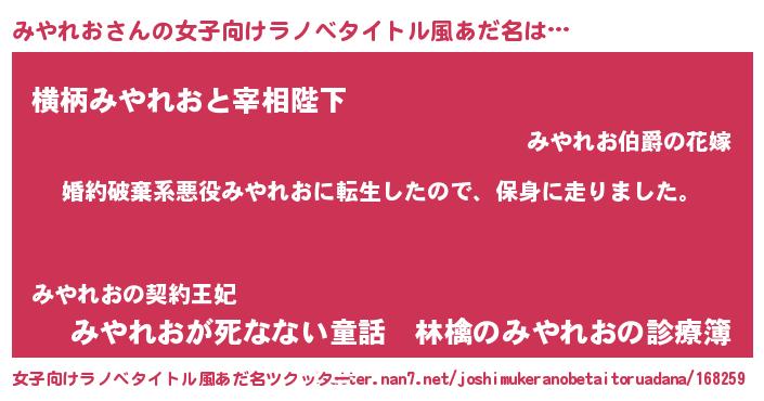 | 男性向けラノベタイトル風あだ名 | 『ミヤレオスレイヤー』 |