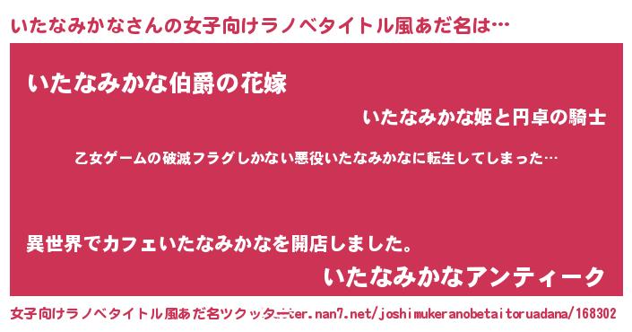 | 胡散臭い通販商品みたいなあだ名 | 『世界中を虜にした世界で10本だけ現存している希少なブランデー…その名も「いたなみかな」』 |