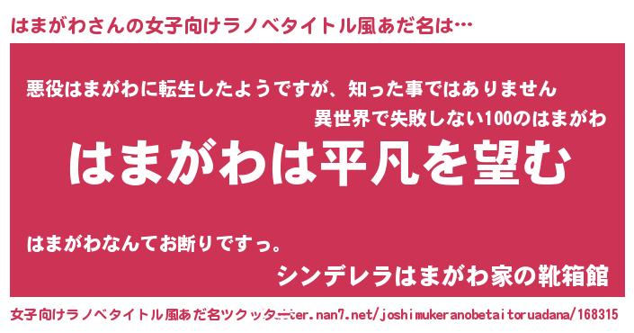 | 胡散臭い通販商品みたいなあだ名 | 『信頼と実績のサプリメント…その名も「はまがわ」』 |