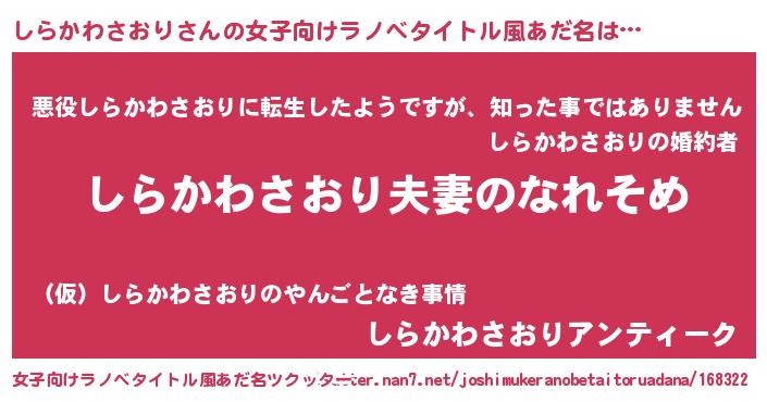 しらかわさおりさんの女子向けラノベタイトル風あだ名は… 『しらかわさおり夫妻のなれそめ』『悪役しらかわさおりに転生したようですが、知った事ではありません』『しらかわさおりアンティーク』 ツクッター #女子向けラノベタイトル風あだ名ツクッター http://tkutter.nan7.net/joshimukeranobetaitoruadana/168322/