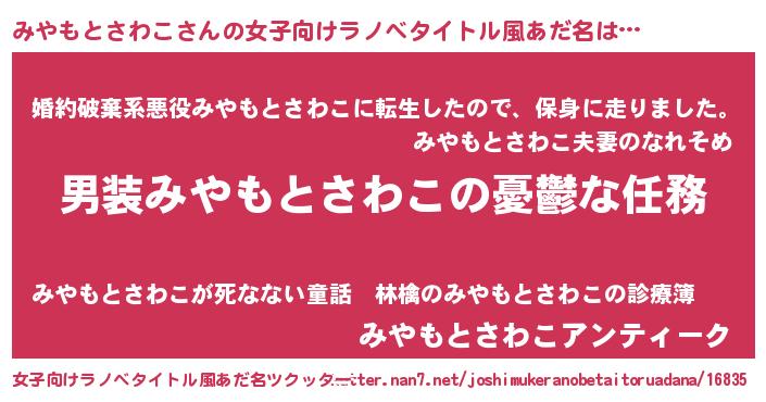 | 男性向けラノベタイトル風あだ名 | 『うちのみやもとさわこが世界を掌握している!』 |