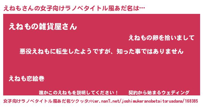 | 男性向けラノベタイトル風あだ名 | 『この素晴らしい世界にえねもを!』 |