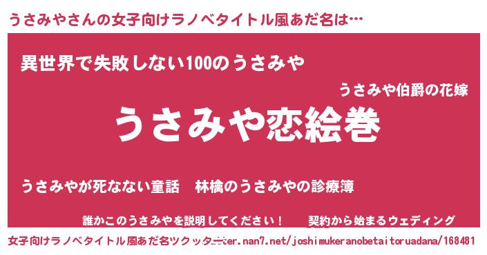 うさみやさんの女子向けラノベタイトル風あだ名は… 『うさみや恋絵巻』『異世界で失敗しない100のうさみや』『誰かこのうさみやを説明してください! ~契約から始まるウェディング~』 ツクッター #女子向けラノベタイトル風あだ名ツクッター http://tkutter.nan7.net/joshimukeranobetaitoruadana/168481/