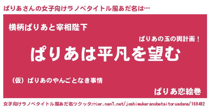 | 男性向けラノベタイトル風あだ名 | 『ダンジョンにぱりあを求めるのは間違っているだろうか』 |