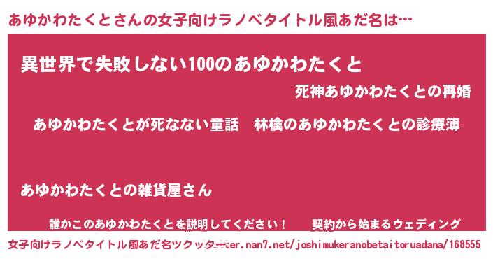 | 男性向けラノベタイトル風あだ名 | 『魔弾の王とあゆかわたくと』 |