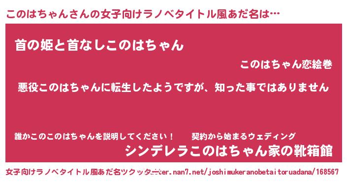 | 男性向けラノベタイトル風あだ名 | 『この素晴らしい世界にこのはちゃんを!』 |