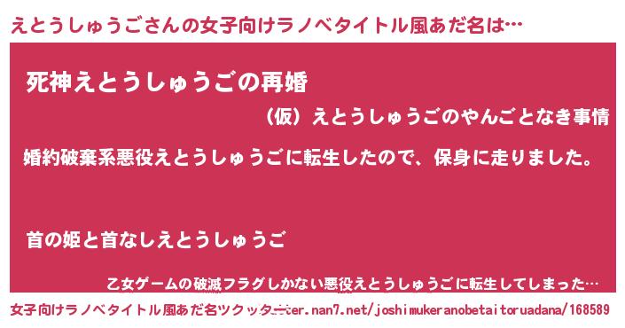えとうしゅうごさんの女子向けラノベタイトル風あだ名は… 『婚約破棄系悪役えとうしゅうごに転生したので、保身に走りました。』『死神えとうしゅうごの再婚』『乙女ゲームの破滅フラグしかない悪役えとうしゅうごに転生してしまった…』 ツクッター #女子向けラノベタイトル風あだ名ツクッター http://tkutter.nan7.net/joshimukeranobetaitoruadana/168589/