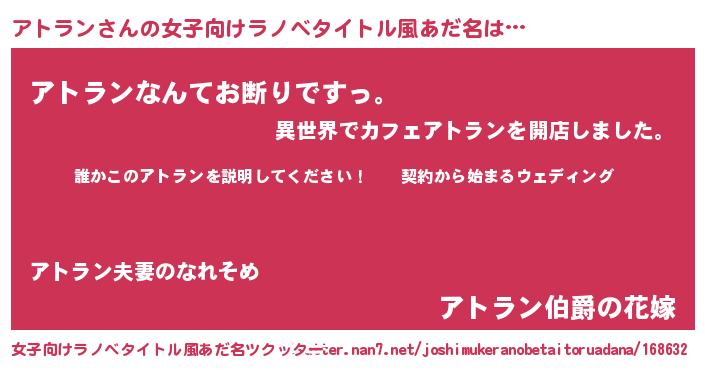 | 男性向けラノベタイトル風あだ名 | 『アトランアートオンライン』 |