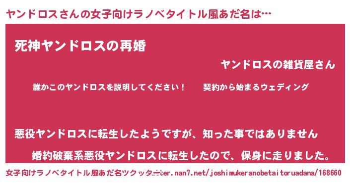 | 男性向けラノベタイトル風あだ名 | 『ヤンドロスアートオンライン』 |