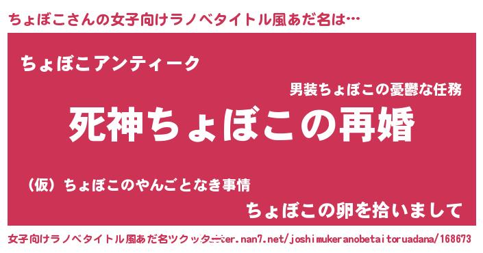 | 男性向けラノベタイトル風あだ名 | 『ノーゲーム・ノーチョボコ』 |