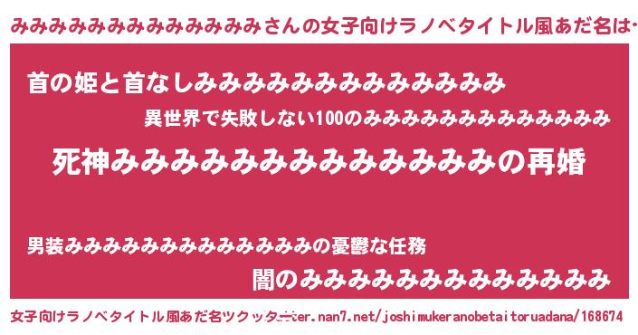 | 男性向けラノベタイトル風あだ名 | 『ノーゲーム・ノーミミミミミミミミミミミミミ』 |