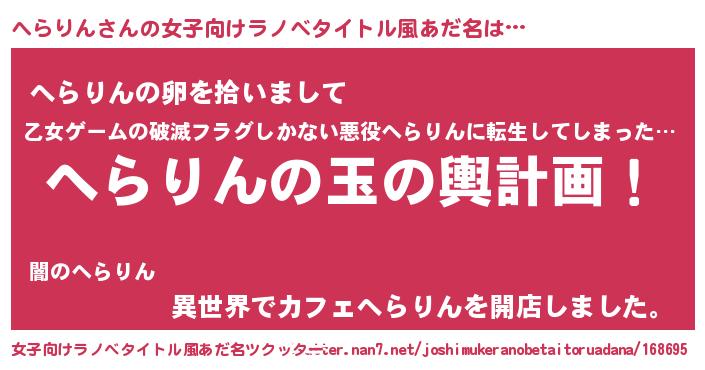 へらりんさんの女子向けラノベタイトル風あだ名は… 『へらりんの玉の輿計画!』『へらりんの卵を拾いまして』『異世界でカフェへらりんを開店しました。』 ツクッター #女子向けラノベタイトル風あだ名ツクッター http://tkutter.nan7.net/joshimukeranobetaitoruadana/168695/