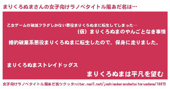 まりくろぬまさんの女子向けラノベタイトル風あだ名は… 『婚約破棄系悪役まりくろぬまに転生したので、保身に走りました。』『乙女ゲームの破滅フラグしかない悪役まりくろぬまに転生してしまった…』『まりくろぬまは平凡を望む』 ツクッター #女子向けラノベタイトル風あだ名ツクッター http://tkutter.nan7.net/joshimukeranobetaitoruadana/16872/