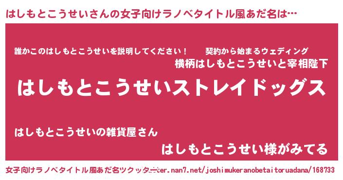 | 男性向けラノベタイトル風あだ名 | 『Re:はしもとこうせいから始める異世界生活』 |