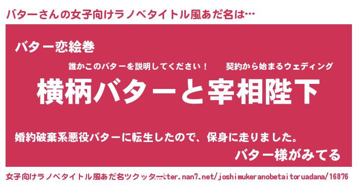 バターさんの女子向けラノベタイトル風あだ名は… 『横柄バターと宰相陛下』『バター恋絵巻』『バター様がみてる』 ツクッター #女子向けラノベタイトル風あだ名ツクッター http://tkutter.nan7.net/joshimukeranobetaitoruadana/16876/