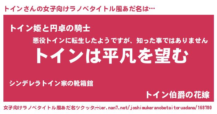 | 男性向けラノベタイトル風あだ名 | 『ダンジョンにトインを求めるのは間違っているだろうか』 |