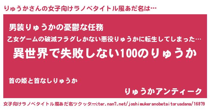 | 男性向けラノベタイトル風あだ名 | 『りゅうかという概念が存在しない退屈な世界 』 |