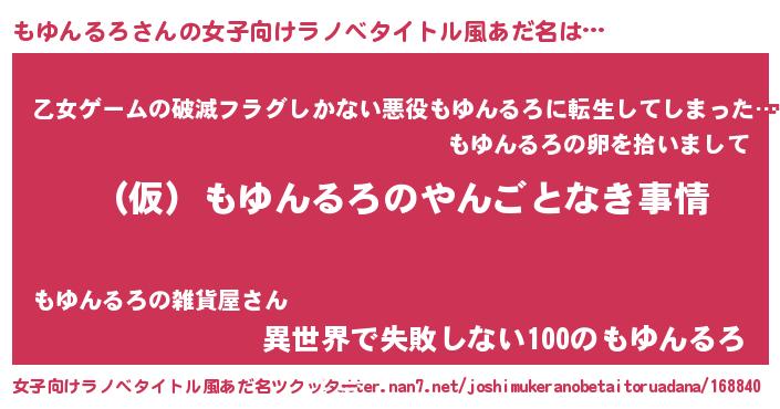| 男性向けラノベタイトル風あだ名 | 『もゆんるろの憂鬱』 |