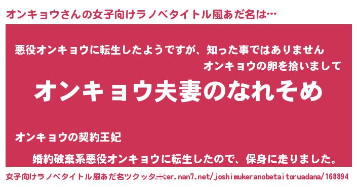 | 男性向けラノベタイトル風あだ名 | 『おまえをオタクにしてやるから、俺をオンキョウにしてくれ! 』 |