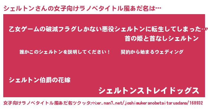 | 男性向けラノベタイトル風あだ名 | 『シェルトンアートオンライン』 |