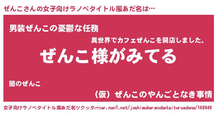 | 男性向けラノベタイトル風あだ名 | 『ぜんこの嫁は女の子じゃないと思った?』 |