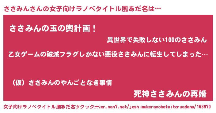 | 男性向けラノベタイトル風あだ名 | 『魔弾の王とささみん』『ささみんの憂鬱』 |