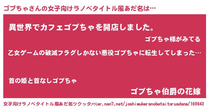 | 男性向けラノベタイトル風あだ名 | 『この素晴らしい世界にゴブちゃを!』 |