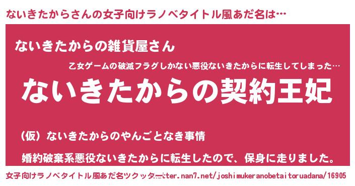 | 男性向けラノベタイトル風あだ名 | 『ないきたからという概念が存在しない退屈な世界 』 |