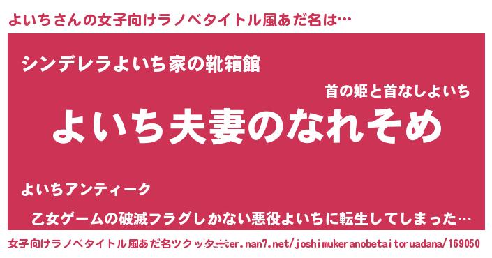 | 男性向けラノベタイトル風あだ名 | 『おまえをオタクにしてやるから、俺をよいちにしてくれ! 』 |