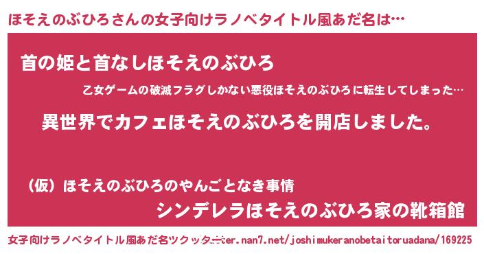 | 男性向けラノベタイトル風あだ名 | 『誰もが恐れるあのほそえのぶひろが、ぼくの専属メイドになるようです。』 |