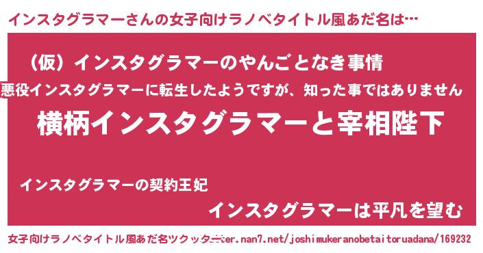 | 男性向けラノベタイトル風あだ名 | 『インスタグラマーに滅ぼされるだけの簡単なお仕事です』 |