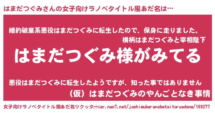 男性向けラノベタイトル風あだ名 | 『はまだつぐみの嫁は女の子じゃないと思った?』 |