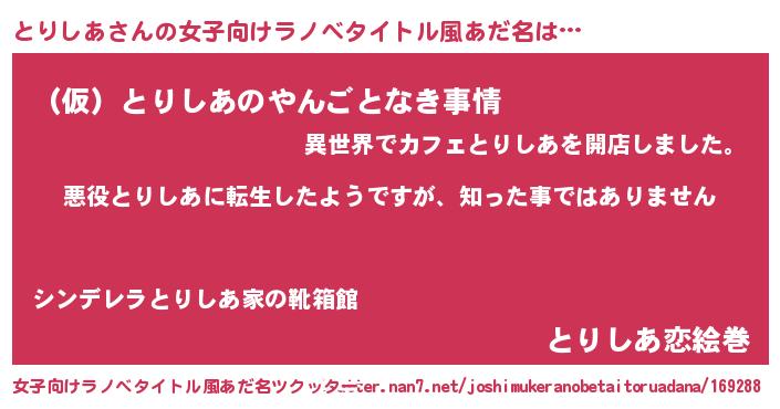 とりしあさんの女子向けラノベタイトル風あだ名は… 『悪役とりしあに転生したようですが、知った事ではありません』『(仮)とりしあのやんごとなき事情』『とりしあ恋絵巻』 ツクッター #女子向けラノベタイトル風あだ名ツクッター http://tkutter.nan7.net/joshimukeranobetaitoruadana/169288/